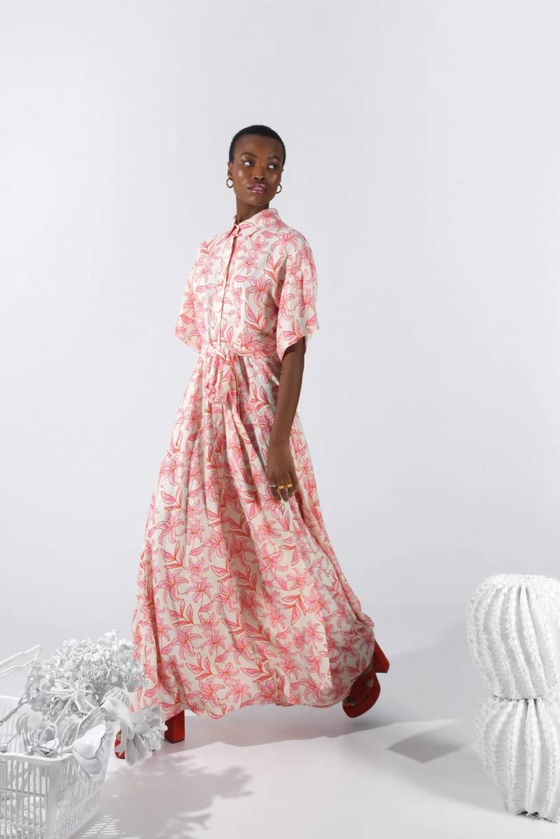 Complete with a matching fabric belt and oval buttons on the front, the dress is a semizie ensemble with its maxi length, it offers both style and sophistication for any occasion.