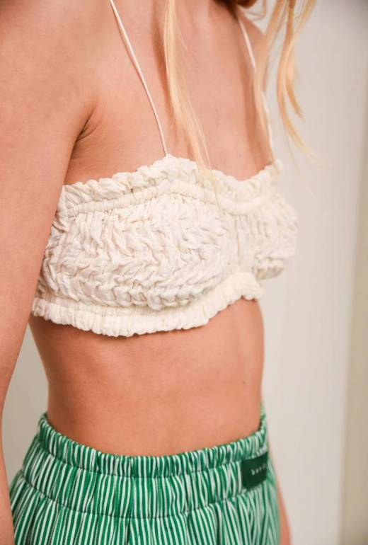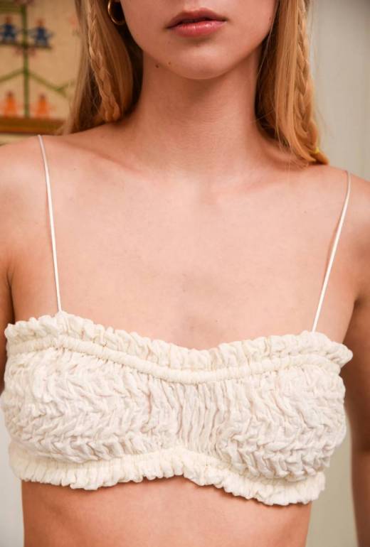 • A dreamy, textured bandeau with delicate ruched detailing, the Sugarcane top is crafted from soft, breathable fabric. Featuring a ruffled trim and ultra-thin straps for an effortless, barely-there feel, it’s the perfect summer essential.