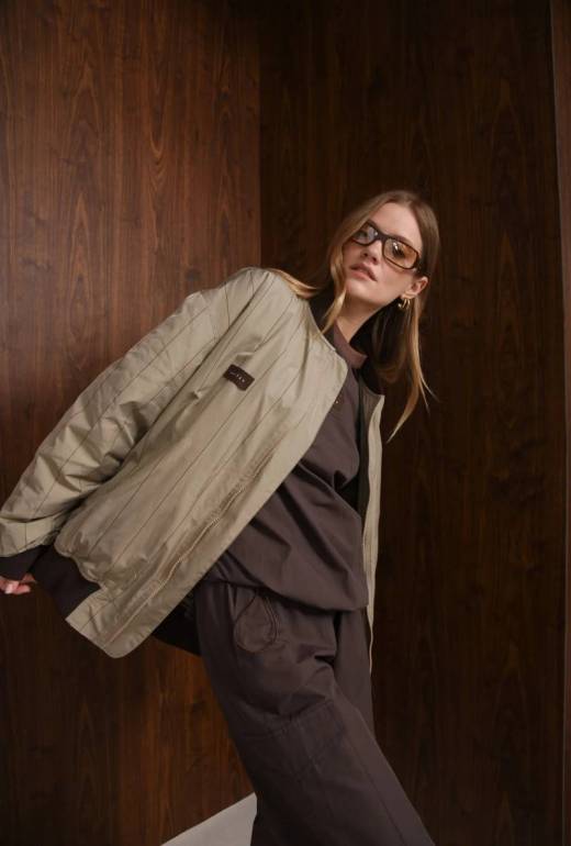 The Expression Bomber Jacket has a relaxed fit and a soft, padded feel for comfort and warmth. It features vertical stitching, a front zip closure, and side pockets. The collar, cuffs, and hem are ribbed in contrast brown ribbed fabric. Finished with a small brown "ARPYES" patch on the chest, it’s an easy everyday outer layer.