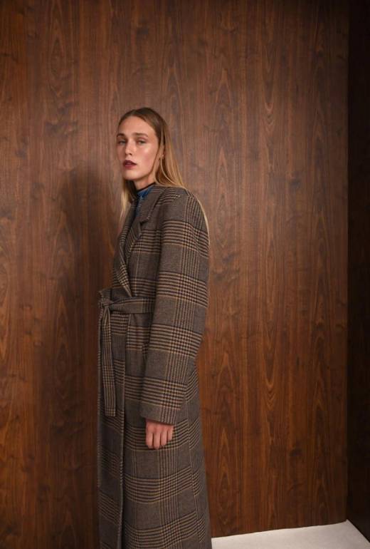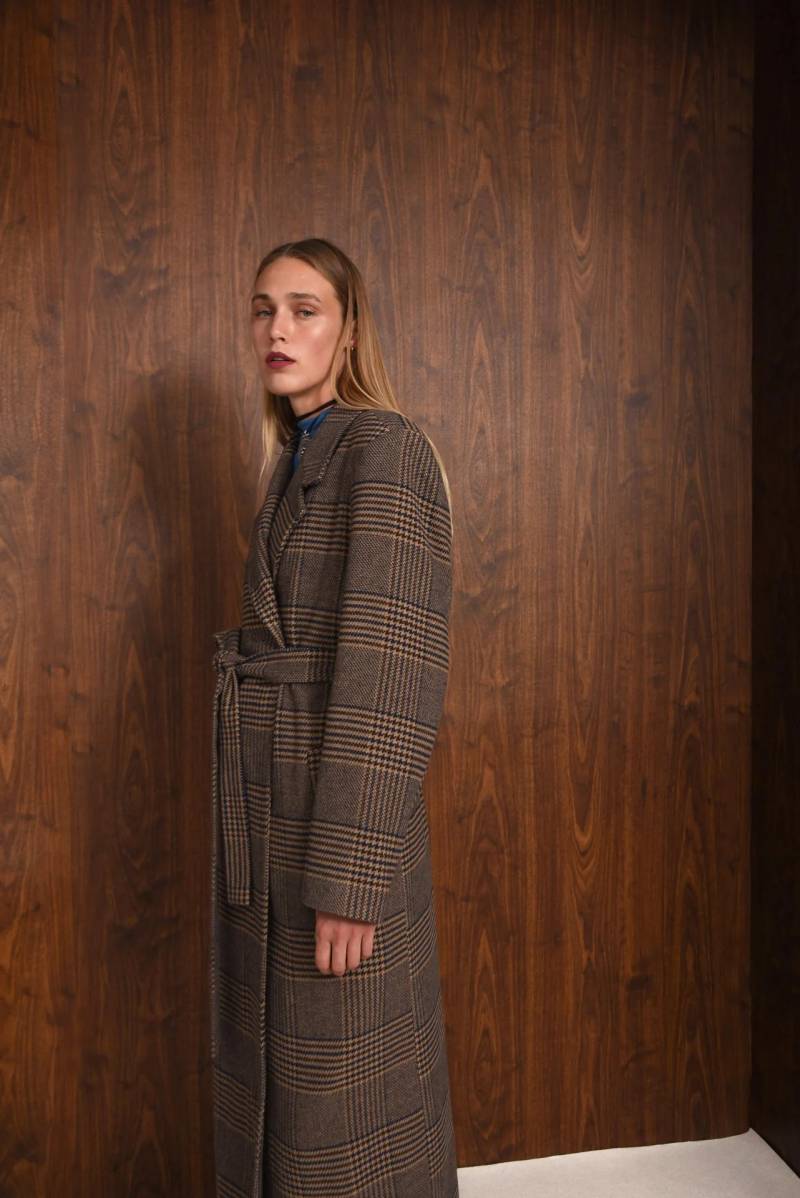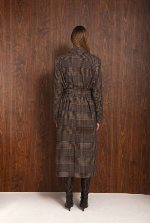 The Myself Coat is a long tailored piece featuring a classic blue plaid pattern. Designed with wide lapels, a single-button closure, and a matching belt that defines the waist. It includes front pockets and a straight cut for a refined silhouette. A timeless, structured coat that combines elegance and versatility for any season.