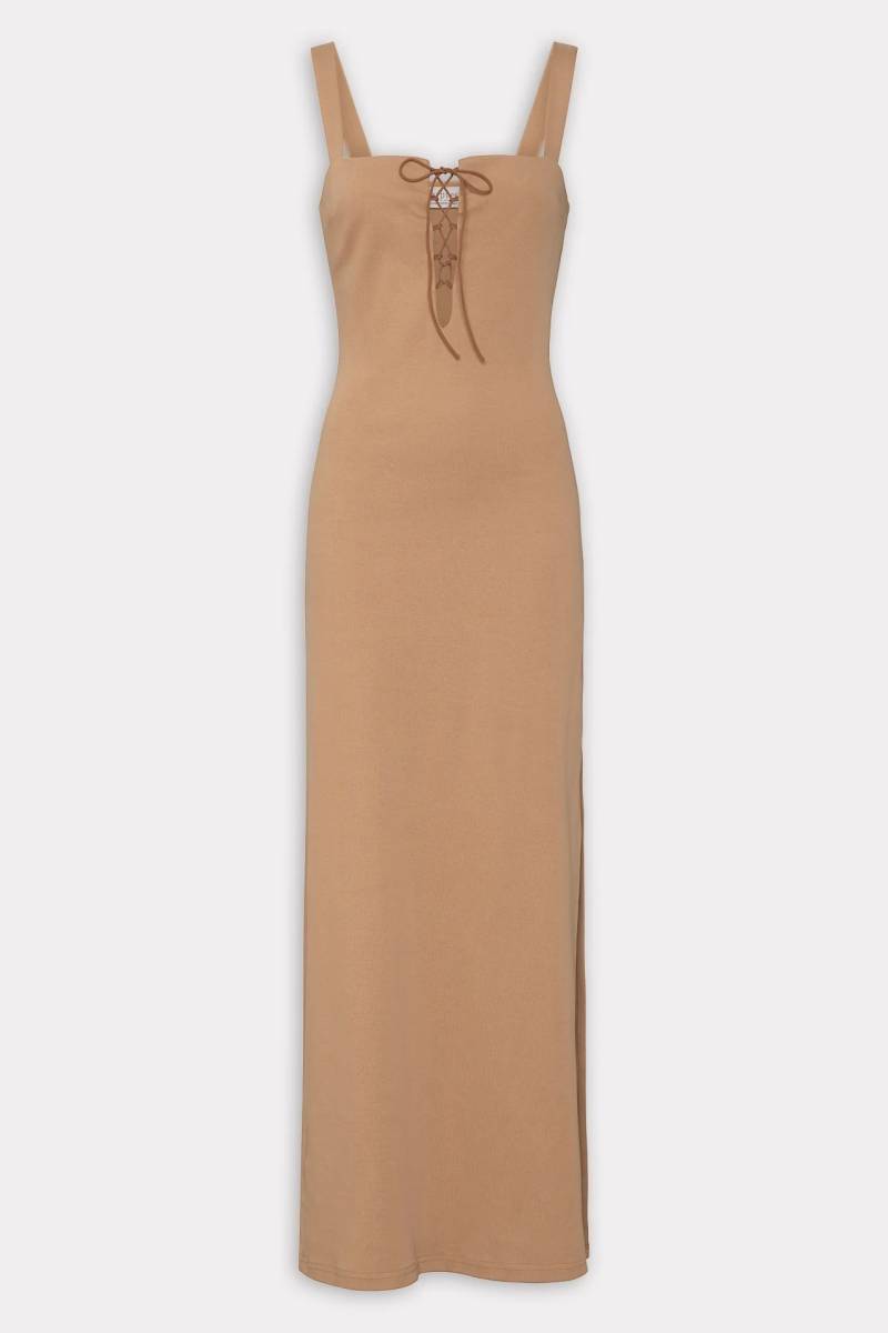 • The Saltfish Maxi Dress is a fitted, sleeveless dress with a square neckline and lace-up front. Made from soft, stretchy fabric, it features wide straps, a side slit, and a straight back. Easy to dress up or down, it comes in dark blue, white, and camel for a clean, modern look.